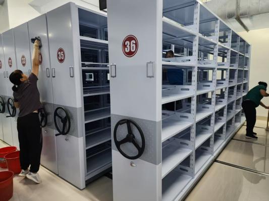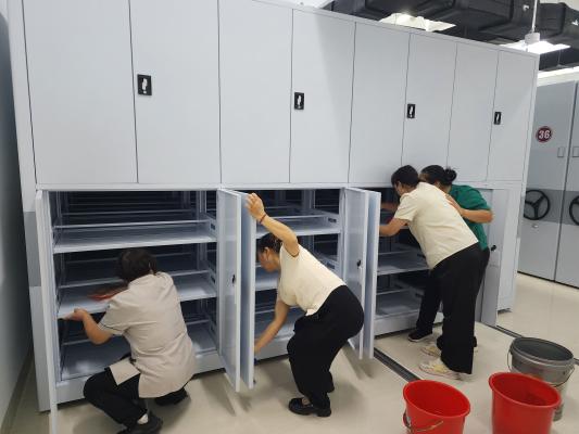 为确保清洁质量与档案安全“双到位”,在实施中,档案馆形成了“专业操作+全程监管+错峰保障”的工作模式。选择周末作业,既避免了对日常工作秩序和查档服务的影响,也使工作人员能够集中精力细致操作,确保清洁工作落到实处。聘请有档案库房清洁经验的专业团队,并在作业前开展专项培训,强调避免触碰档案、控制清洁力度等关键细节,清洁过程中,从库房外通道到内部密集架的顶部、底部及轨道缝隙,均使用软质工具,全程轻缓细致,严防档案受损。同时,档案馆干部职工全程参与监管,不仅对照标准逐项检查清洁环节,排查卫生死角,还实时提醒作业人员避开档案存放区域,最大限度防范意外风险。清洁结束后,档案馆迅速启动温湿度调控系统,将库房环境精准控制在档案保存的最佳范围,并对密集架进行逐一检查,确保档案归位整齐、无二次污染。