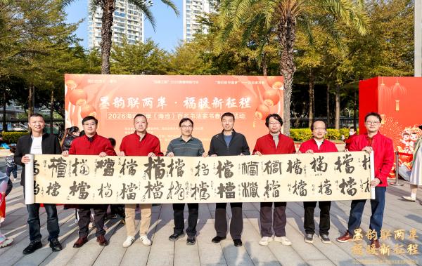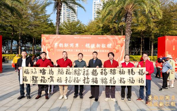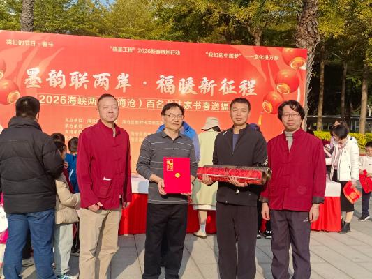 1月24日,厦门市海沧区档案馆工作人员来到“墨韵联两岸·福联新征程”2026海峡两岸(海沧)百名书法家书春送福活动现场征集百“福”长卷。当日,来自海峡两岸的百名书法家现场挥毫泼墨,为群众书写春联和祝福,联袂创作百“福”长卷,这是厦门市海沧区历年的传统特色品牌活动。